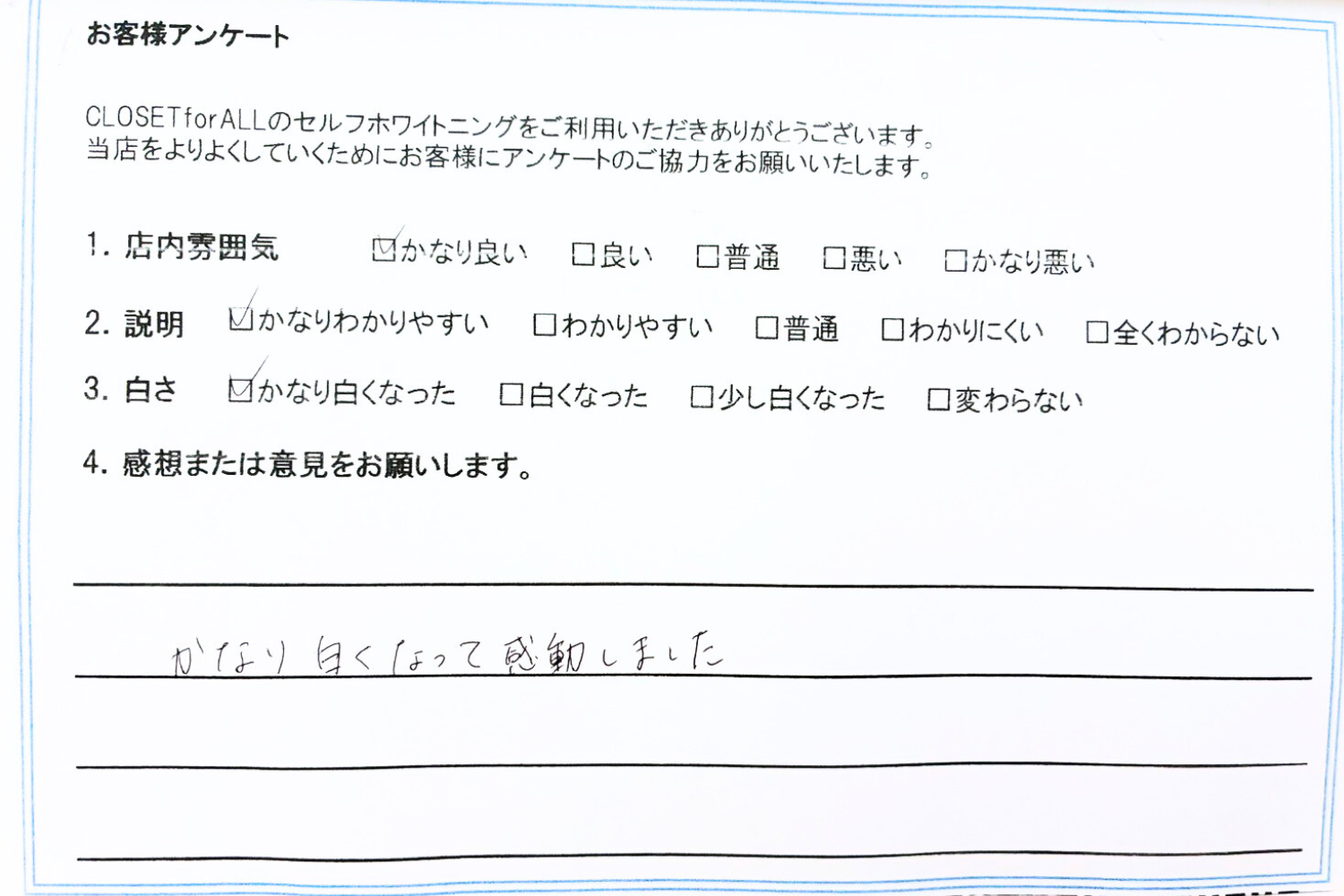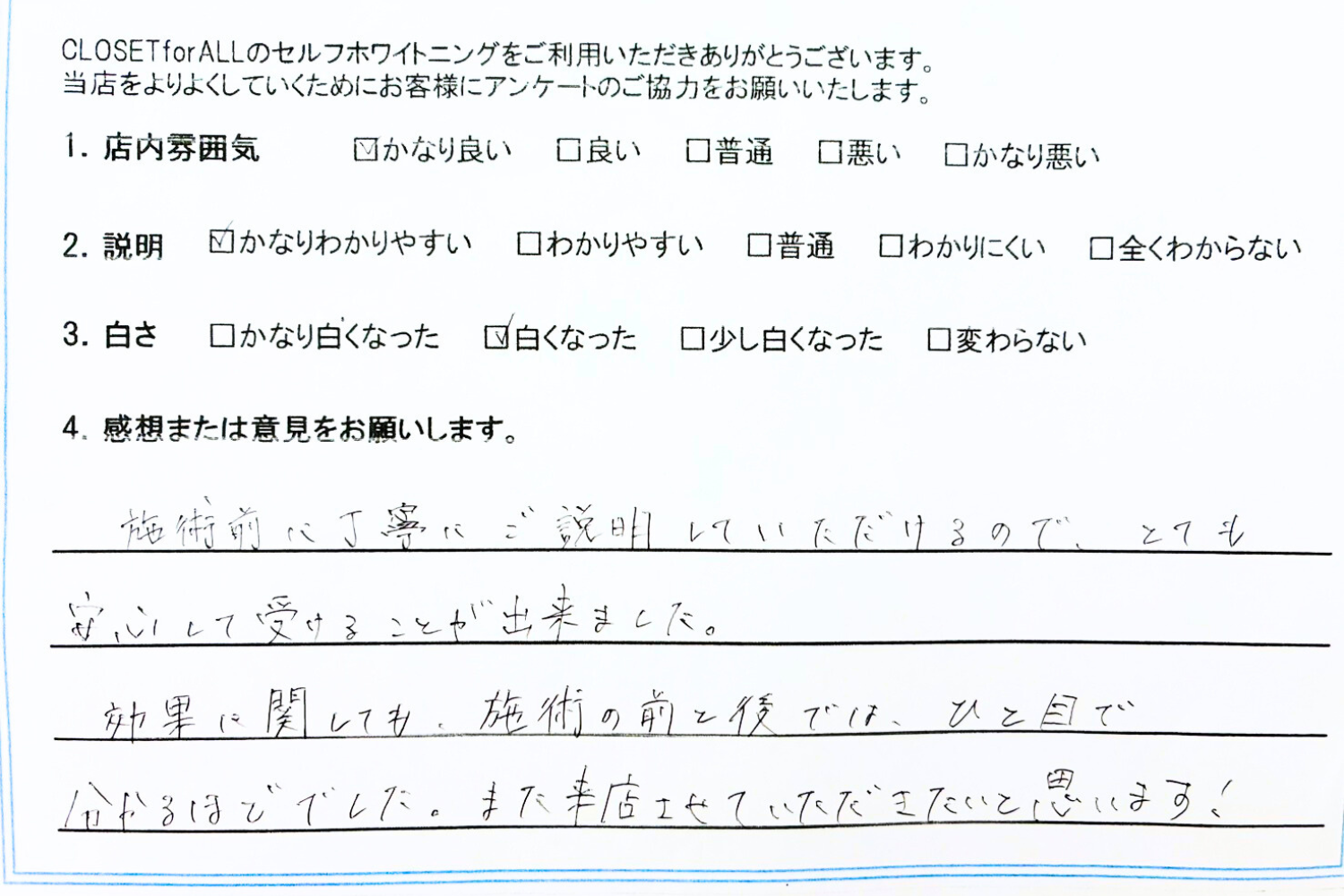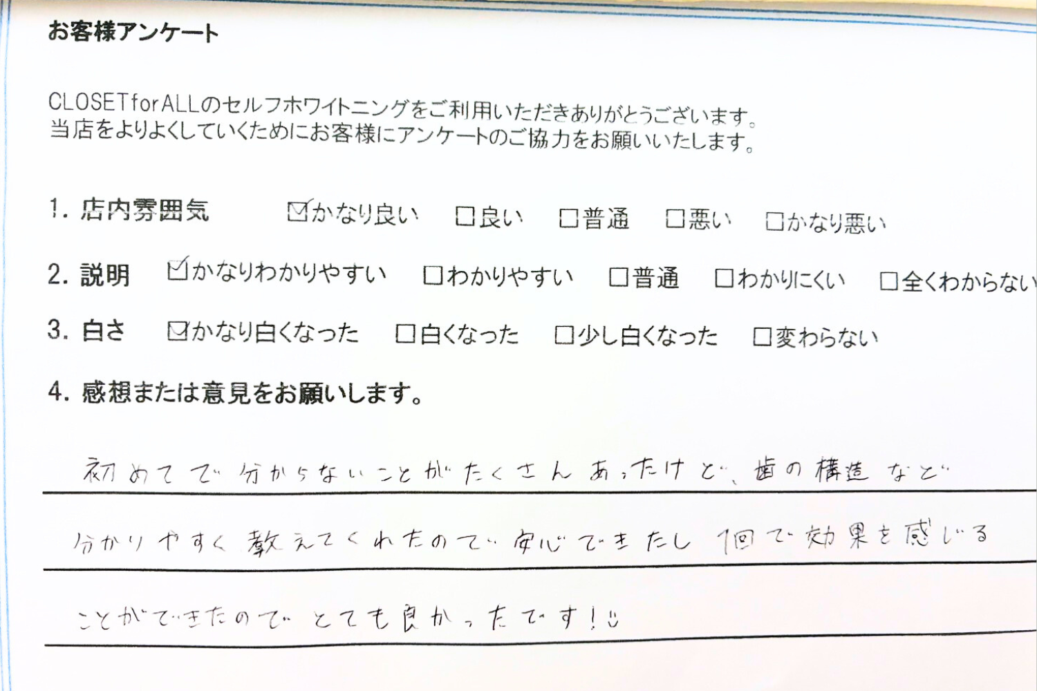 初めてでわからないことがたくさんあったけど、歯の構造などわかりやすく教えてくれたので安心できたし、1回で効果を感じることができたのでとても良かったです。