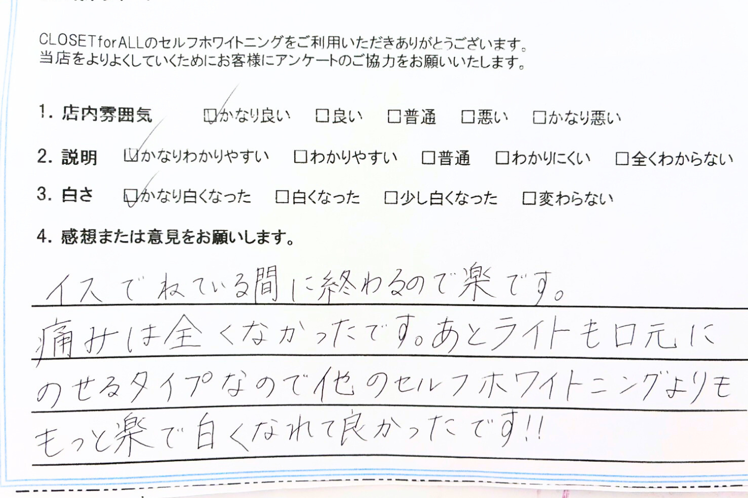 イスで出ている間に終わるので楽です。痛みは全くなかったです。あとライトも口元に載せるタイプなので他のセルフホワイトニングよりももっと楽で白くなれてよかったです!